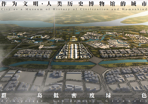 黄河沿いの広大な敷地にテーマパークをつくることになった。更地に新市街地を計画するのは非常に難しいことだ。建築家が関わってよい仕事であるかどうか疑ってさえいる。ところが、このプロジェクトには、いわゆる新市街ではなく、テーマパークを主体とした地域を計画するという特異なコンセプトが据えられた。そのテーマパークは歴史をテーマとしていて、中国史ひいては人類史を体験できる遊興空間となる。それは無理矢理その土地に参照すべき歴史をねじ込むということでもある。こうとまでなれば都市計画という行為そのもへの懐疑も薄れ、計画への動機付けはいささか異なったものとなってくる。明確で単純な目的をもったとき、「計画概念」は極めて有効な手段となるからだ。