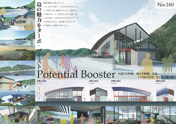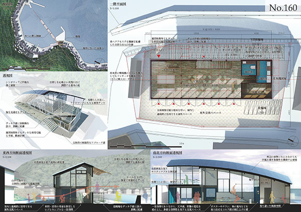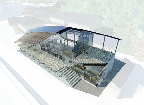 四国の西端に位置する八幡浜の離島、大島に観光・交流拠点を提案する設計競技である。事務所として初めて参戦する(合作ではない)コンペ。意気揚々と臨んだ。しかし、島の人口・年齢構成とその将来予測を知って衝撃を受けた。もはや建築の力で解決できるような数値や課題ではない。それでも「箱物」を作ることに意味があり、価値あるものを建築たらしめるとすれば、その建物はアイコニックであるほかない。統計的には沈みゆく島に何らかの標を歴史として刻む。その建物は短命かもしれない。近い未来の遺跡。そんな覚悟だけが、実際にはこの建築の存在価値である。