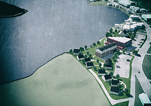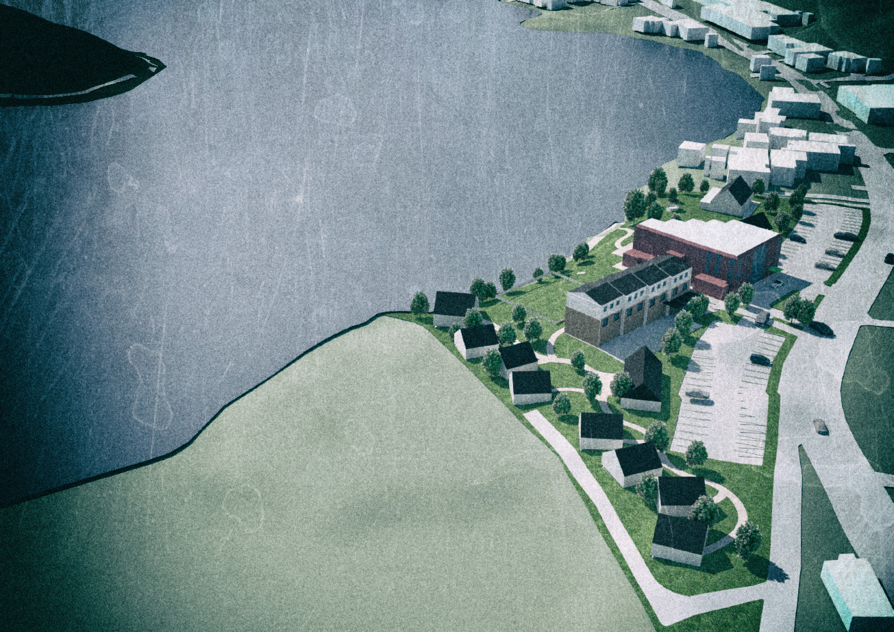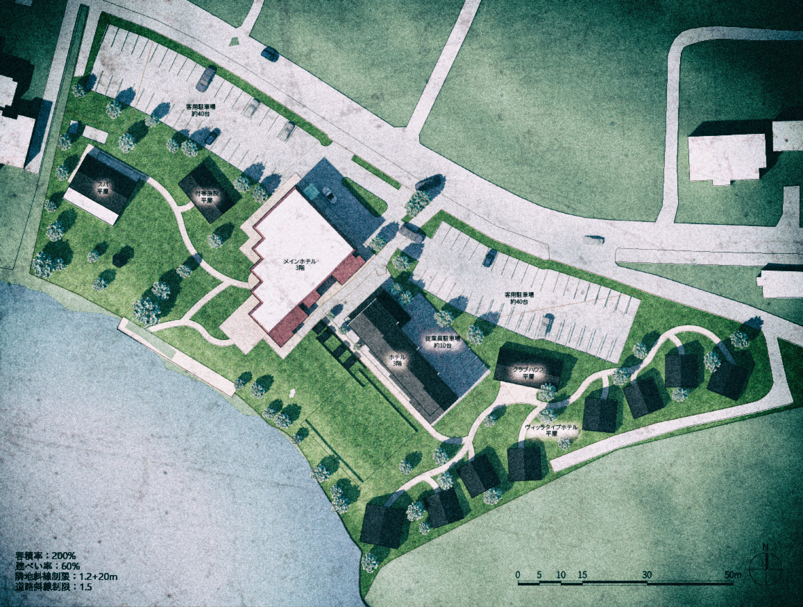 京都府の北部、とある水辺の保養地に対する提案である。神秘的な風景と既存の施設群を活かし、一帯の土地を有効に活用するための提案を行った。(二〇一八年四月十日)